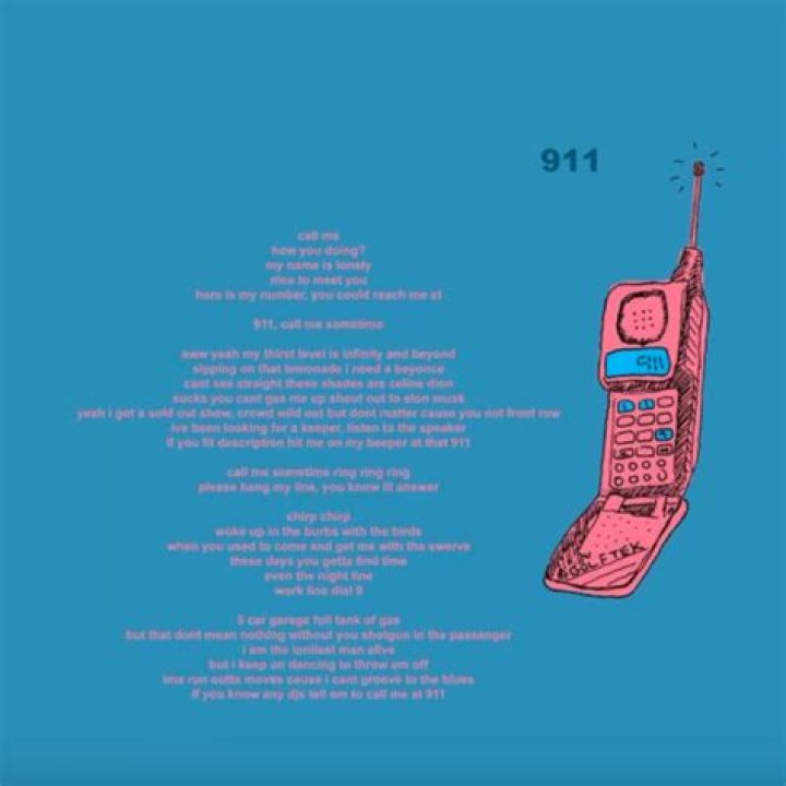 911, call me some time 911, (you should call me, oh) 911, (you should call me) Chirp, chirp Chirp, chirp Woke up in the 'burbs, 'burbs, with the birds, birds. Where you used to come and get me with the swerve, swerve These days you gotta find time Even the night line Work line Dial nine. Five car garage Full tank of the gas But that don't mean ...TYLER, THE CREATOR - 911 / MR. LONELY LYRICS