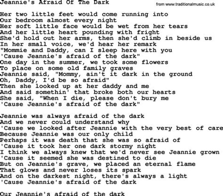 Get lyrics of Afraid of the dark song you love. List contains Afraid of the dark song lyrics of older one songs and hot new releases. Get known every word of your favorite song or start your own karaoke party tonight :-).