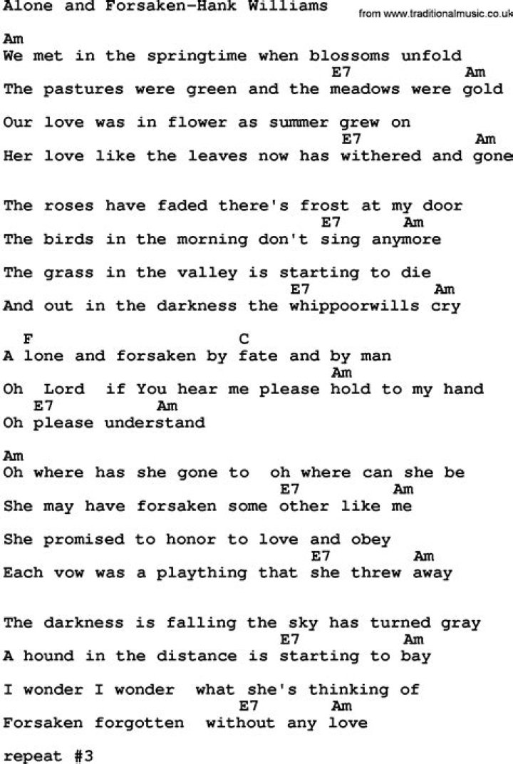 Get lyrics of Alone and forsaken song you love. List contains Alone and forsaken song lyrics of older one songs and hot new releases. Get known every word of your favorite song or start your own karaoke party tonight :-).