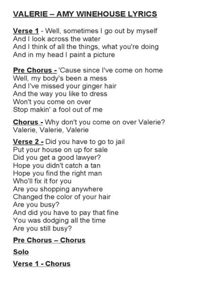 "Valerie" (originally by Amy Winehouse) Well sometimes I go out by myself And I look across the water And I think of all the things, what you're doing And in my head I paint a picture Since I've come on home, Well my body's been a mess And I've missed your ginger hairAmy Winehouse - Valerie - Live Amy Winehouse - Valerie ...