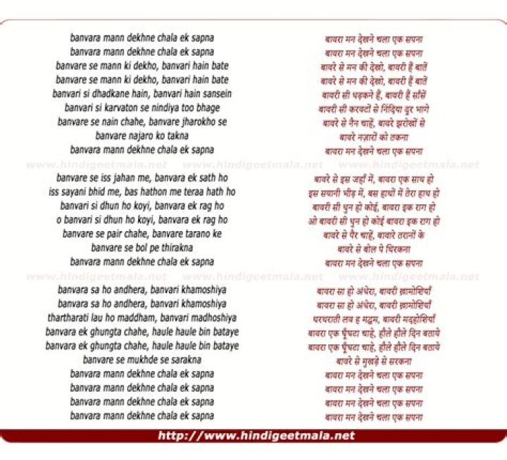 Get lyrics of Bawara mann song you love. List contains Bawara mann song lyrics of older one songs and hot new releases. Get known every word of your favorite song or start your own karaoke party tonight :-).