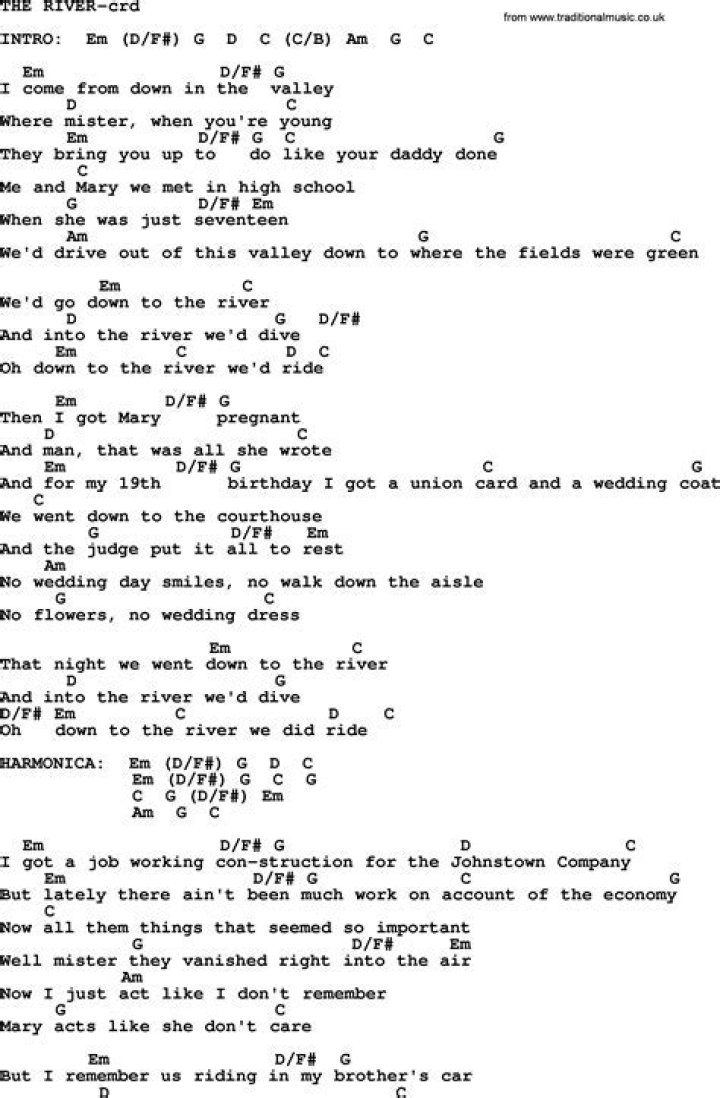 I was born by the river in a little tentOh and just like the river I've been running ever sinceIt's been a long, a long time comingBut I know a change gonna come, oh yes it willIt's been too hard living but I'm afraid to die'Cause I don't know what's up there beyond the sky ...Bruce Springsteen - The River Lyrics
