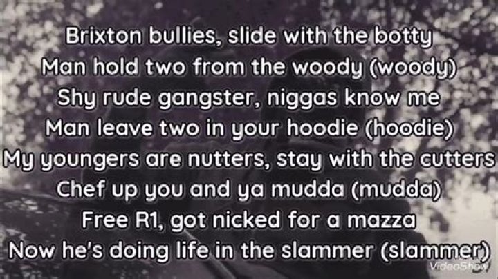 Brixton bullies, slide with the botty Man hold two from the woody (Woody) Siru gangster, niggas know me Man leave two in your hoodie (Hoodie) My young g's are nutters, stay with the cutters Chef up you and ya mudda (Mudda) Free R1, got nicked for a mazza Now he's doing life in the slammer (Slammer)Stabber - Welcome To Brixton Lyrics