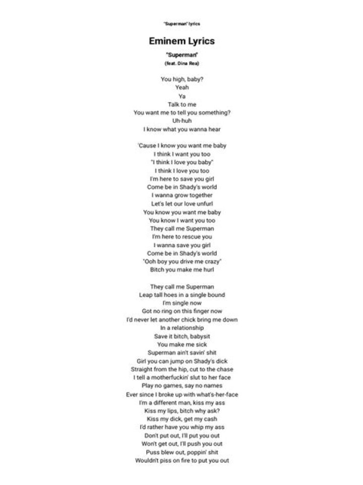 Lyrics to "Say What You Say" song by EMINEM: Huh, so I'm out the game huh? Yo Dre ... [Eminem] I was born to brew up storms 'n stir up shit. Kick up dust, cuss ' til I slur up spit. Grew up ... Bullet with your name, sending it your way ... You better get a vest, then invest in something. To protect your head and neck [ Eminem]EMINEM LYRICS - Steve Berman (Skit)