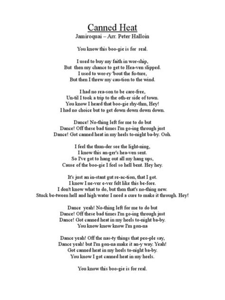Lyrics to 'Fire' by The Ventures. You are now ... 6 Country Funk and the Canned Heat. 7 Born to Be Wild. 8 Sunshine of Your Love. 9 The Weight. 10 Light My Fire. 11 ...Jamiroquai - Canned Heat Lyrics