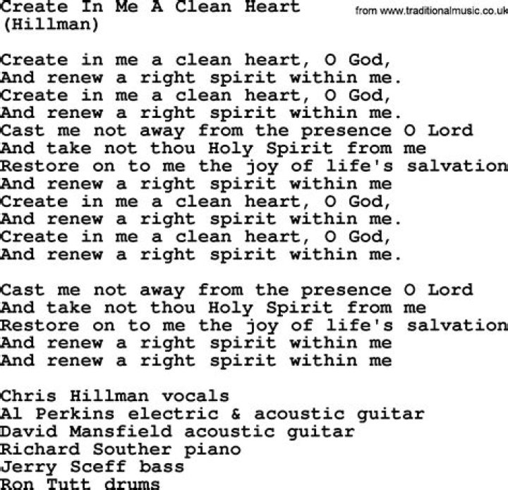 Get lyrics of Create in me a clean heart song you love. List contains Create in me a clean heart song lyrics of older one songs and hot new releases. Get known every word of your favorite song or start your own karaoke party tonight :-).