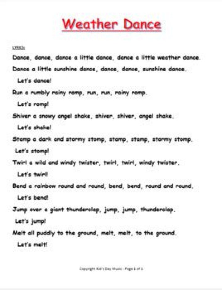 Baby Fish. 5. Today Is Sunday. 6. Banana Dance (Vocal) Dr. Jean Feldman - Weather Song Lyrics. Sunny, sunny, sunny, sunny It is sunny in the sky S-U-N-N-Y, sunny It is sunny in the sky Cloudy, cloudy, cloudy, cloudy It is cloudy in th.DIONNE WARWICK - SUNNY WEATHER LOVER LYRICS