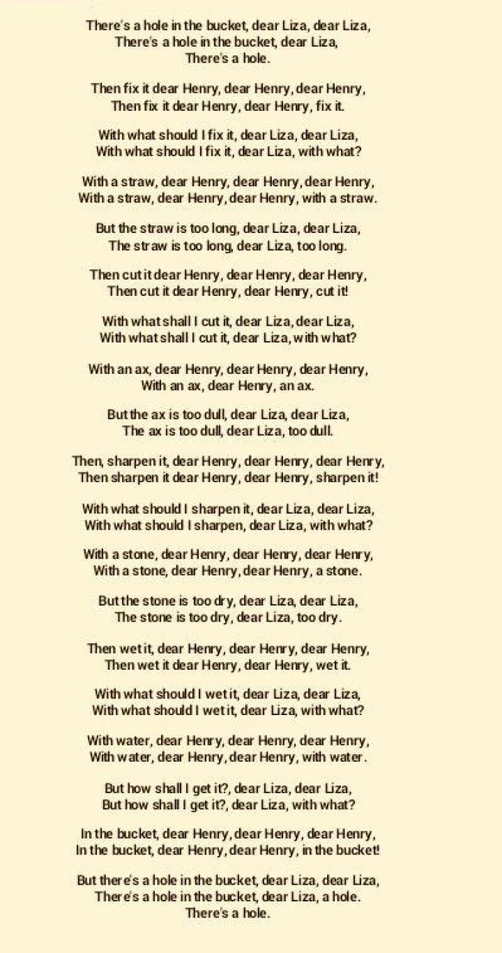Feb 18, 2017 ... dear Liza, dear Liza There's a hole in my o-zone dear Liza, a hole Then nuke it dear Henry, dear Henry, dear Henry Then nuke it dear Henry, ...SPEARHEAD - HOLE IN THE BUCKET LYRICS