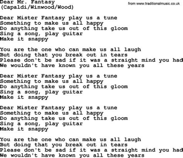 Lyrics to 'Dear Mr. Fantasy' by Steve Winwood. Dear Mr. Fantasy play us a tune / Something to make us all happy / Do anything, take us out of this gloom / Sing.STEVE WINWOOD LYRICS - Dear Mr. Fantasy