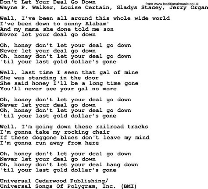 Don't you let that deal go down Since you poured the wine for me And tightened up my shoes I hate to leave you sitting there Composing lonesome blues It goes to show that you don't ever know Watch each card you play and Play it slow Wait until your deal come 'round Don't you let that deal go down Don't you let that deal go downCHARLIE POOLE - DON'T LET YOUR DEAL GO DOWN BLUES LYRICS