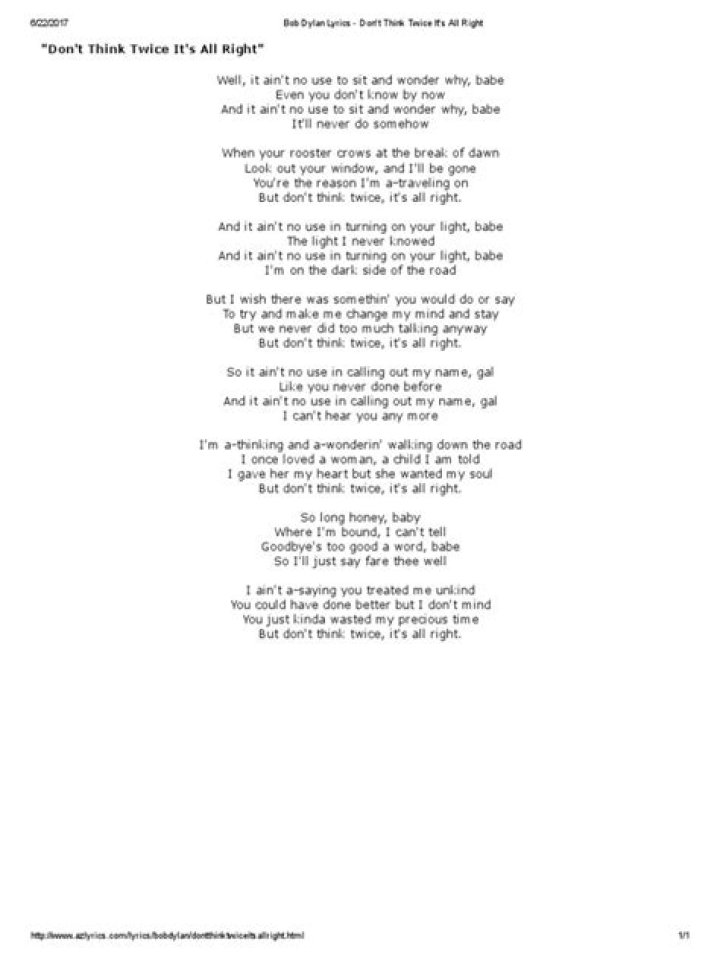 So don't think twice, it's all right. It ain't no use in callin' out my name, gal Like you never did before It ain't no use in callin' out my name, gal I can't hear you anymore I'm a-thinkin' and a-wond'rin' all the way down the road I once loved a woman, a child I'm told I give her my heart but she wanted my soul But don't think twice, it's ...BOB DYLAN - DON'T THINK TWICE, IT'S ALRIGHT LYRICS