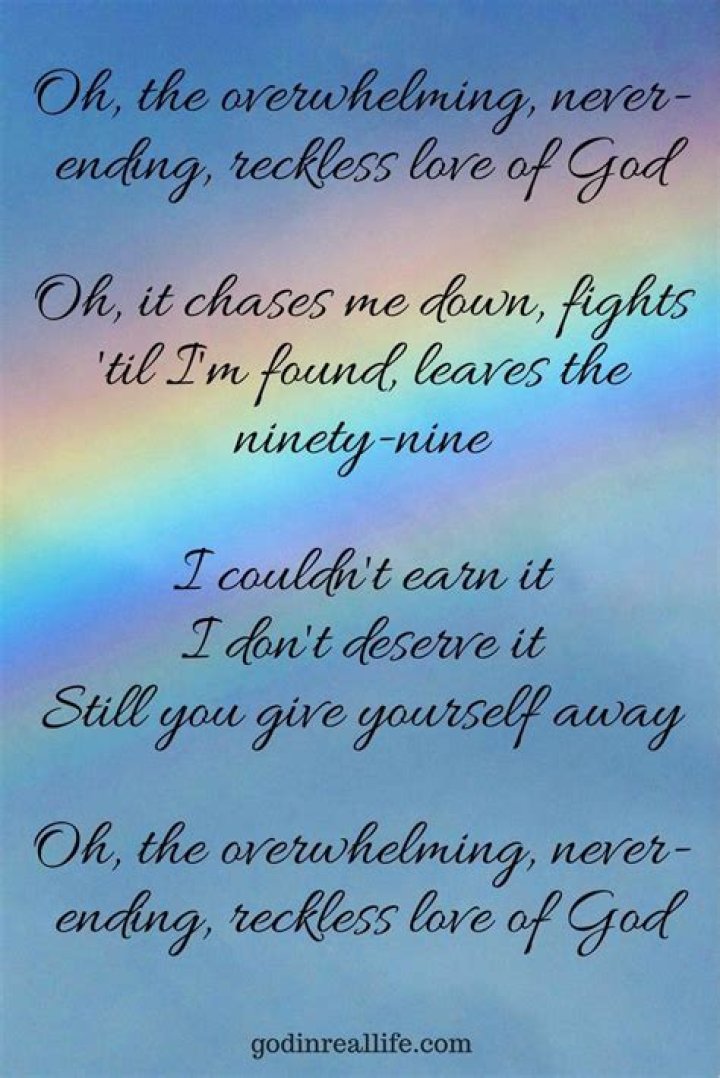 The overwhelming, never-ending Reckless love of God Oh, it chases me down Fight 'til I'm found Leaves the ninety-nine I couldn't earn it and I don't deserve it Still you give yourself away The overwhelming, never-ending Reckless love of God When I was your foe Still your love fought for me You have been so, so good to me When I felt no worthHollyn - i think we should break up Lyrics