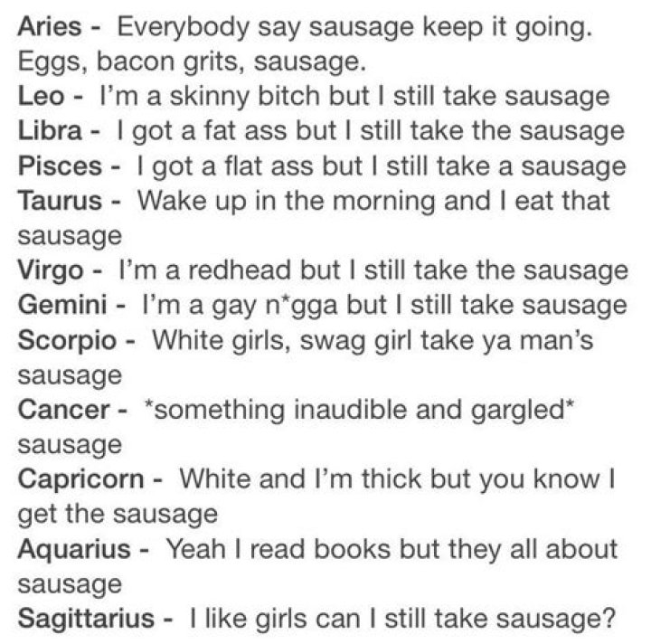 "Sausage". Everybody get up. Good morning to you. The birds are chirping. I don' t fuck with you. Eggs, bacon, grits. You better use a condom if you taking that