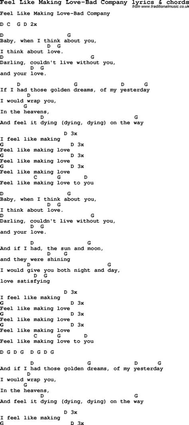 Bad Company - Feel Like Making Love Lyrics. Baby, when I think about you, I think about love Darlin', don't live without you and your love If I had those golden dreams of my yesterdays. Lyrics. Popular Song Lyrics. Billboard Hot 100. Upcoming Lyrics. Recently Added. Top Lyrics of 2011.Roberta Flack - Feel Like Makin' Love Lyrics