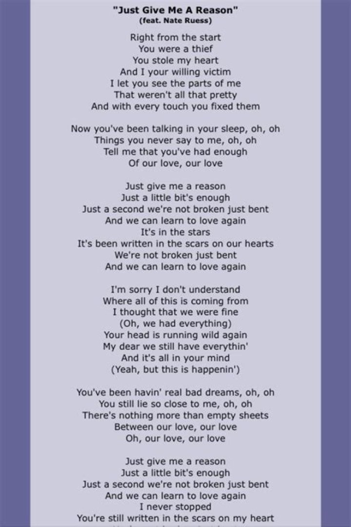 Lyrics to 'You Were Mine' by Dixie Chicks. I Can't Find A Reason To Let Go / Even Though You've Found A New Love / And She's What Your Dreams Are Made Of / IPink - Just Give Me A Reason Lyrics