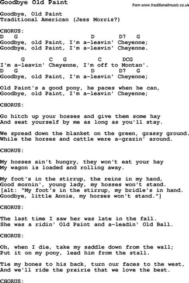 Goodbye, old Paint, I'm a-leavin' Cheyenne. My foot's in the stirrup, my rein in my hand I'm a-leavin' Cheyenne, I'm off to Montan' Goodbye, old Paint, I'm a-leavin' Cheyenne; My horses ain't hungry, they won't eat your hay My wagon is loaded and rolling away. We ride all day 'till the sun's going down I'm gonna be glad to get out of this town.Goodbye Old Paint lyrics by Tex Ritter - original song full text ...