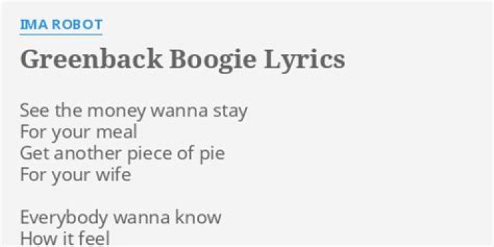 Dec 29, 2015 Lyrics for Greenback Boogie by Ima Robot. See the money wanna stay, for your meal Get another piece of pie, for your wife Everybody ...Greenback Boogie Lyrics - Ima Robot