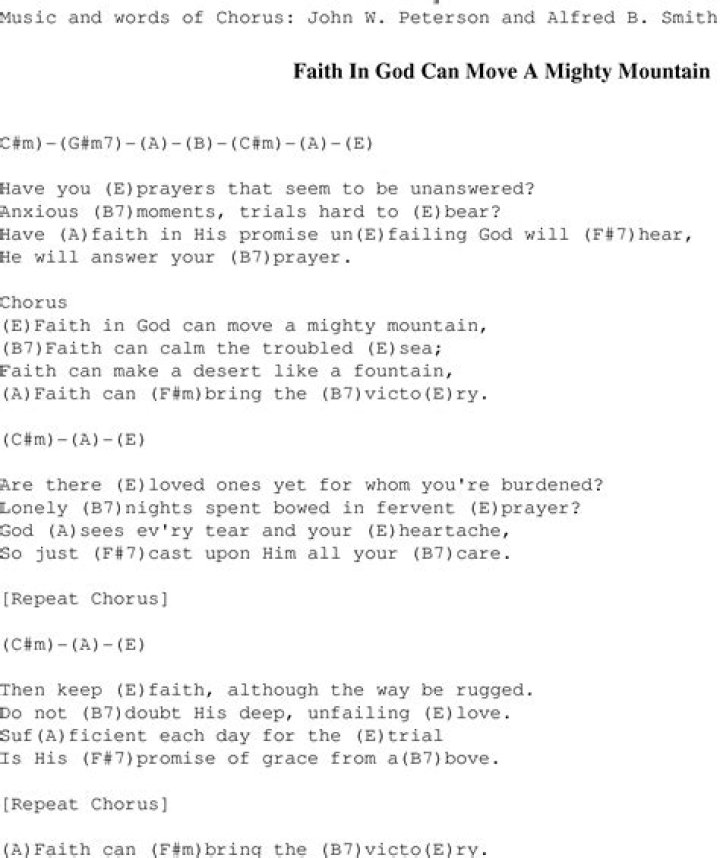 Faith can move a mountain Cast it in the sea If you don't doubt in your heart But just believe Whatever you desire, ask when you pray Believe it, and you shall receive it God will surely make a way Faith can move a mountain Cast it in the sea If you don't doubt in your heart But just believe Whatever you desire, ask when you prayCONNIE SMITH - YOU CAN MOVE THAT MOUNTAIN LYRICS