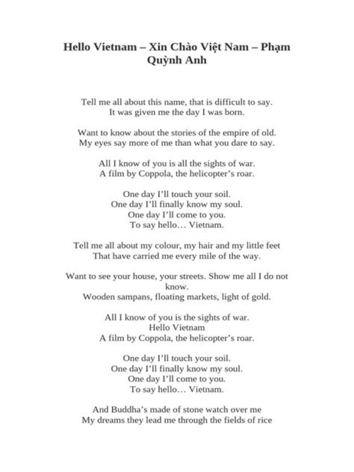 Lyrics for Hello Vietnam by Quynh Anh. Tell me all about this name, that is difficult to say. It was given me the day I was born. Want to know about the stori...