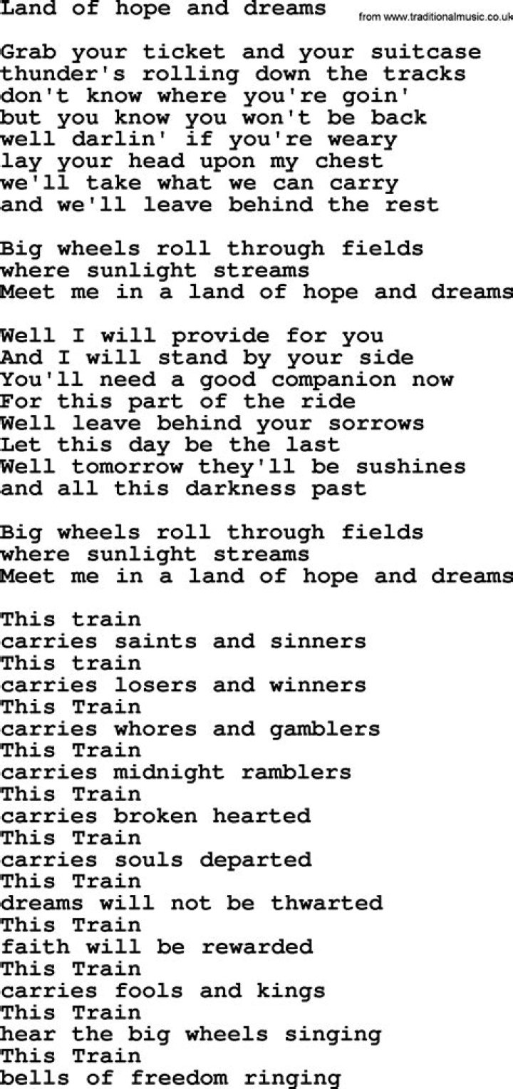 Get lyrics of Land of hope and dreams song you love. List contains Land of hope and dreams song lyrics of older one songs and hot new releases. Get known every word of your favorite song or start your own karaoke party tonight :-).