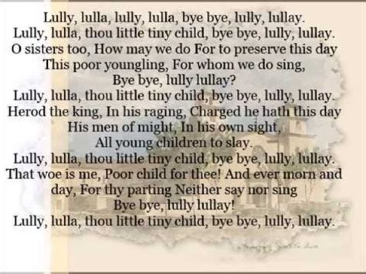 By, by, lully, lullay. O sisters, too, how may we do, For to preserve this day; This poor Youngling for whom we sing, By, by, lully, lullay. Herod the King, in his raging, Charged he hath this day; His men of might, in his own sight, All children young, to slay.Lully, Lulla - Winchester Cathedral Choir, David Hill & Kenan Burrows