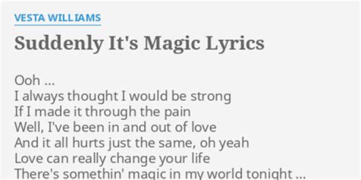 Lyrics for It Must Be Magic by Teena Marie. Hee (You are under my power) (It is the power of love) Oh, oh, oh, oh, oh, oh, oh, oh, oh Oh, oh, oh, oh, oh, oh, oh, oh, oh You say my kisses taste like magic, well, stop That's got to be the classic line Please no more presto change-o Now that I'm in love, baby, 'cause that would really blow my mind ...Joe Brooks - Magic Lyrics