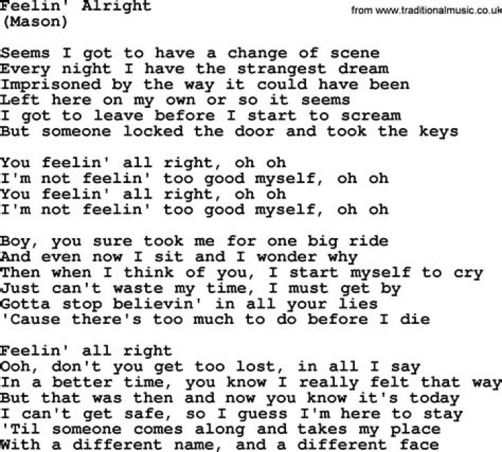 Make me feel so good. Woman, woman, woman, woman. Woman, woman, woman, woman. Make me feel alright. You're alright, alright, alright. Alright, alright ...Feeling Alright Lyrics - Michael Johns
