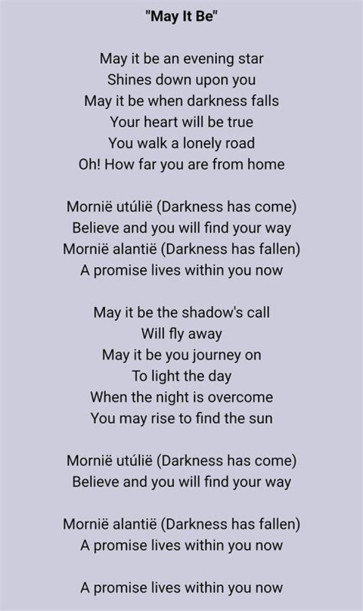 May it be the shadows call Will fly away May it be your journey on To light the day When the night is overcome You may rise to find the sun Mornie utulie (darkness has come) Believe and you will find your way Mornie alantie (darkness has fallen) A promise lives within you now... A promise lives within you now...The Lord Of the Rings Soundtrack - May It Be Lyrics