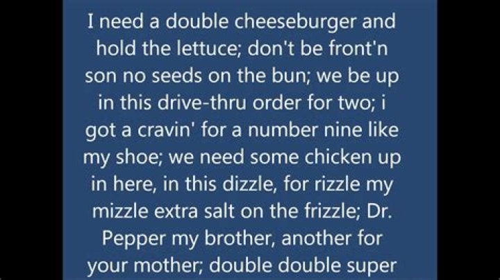 Lyrics to Mcdonalds Rap. Mcdonalds Rap Video: I need a double cheeseburger, ... no seeds on my bun. We'll be up in this drive-through order for two, I've got a cravin for a number nine like my shoe. We need some chicken up in here in this rizzle, for rizzle my nizzle extra salt on the frizzle. Dr.Pepper my brother, another for your mother.Fast Food Rockers - Fast Food Song Lyrics