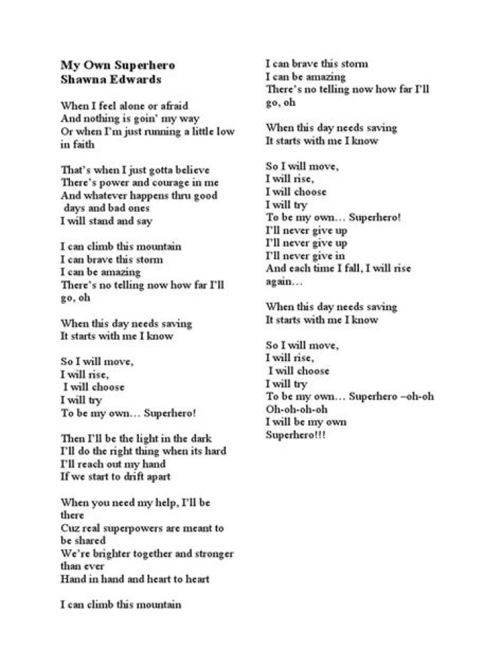 Lyrics for My Own Superhero by Shawna Edwards feat. Hallie Cahoon & William Kim. Type song title, artist or lyrics. Musixmatch PRO Top lyrics Community Contribute. Sign in. LyricsMy Own Superhero Shawna Edwards, Hallie Cahoon, William Kim. Lyrics not available. Be the first to add the lyrics and earn points.Simon Curtis - Superhero Lyrics