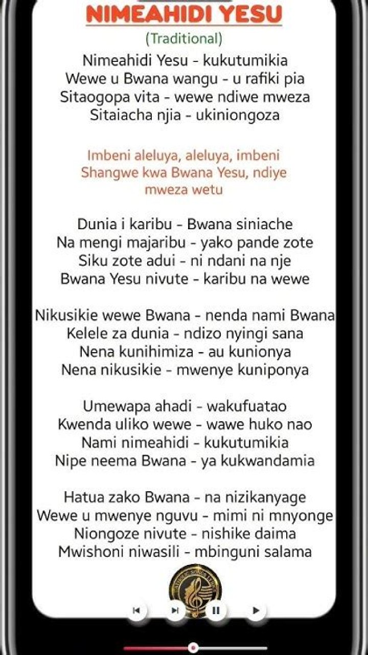 Browse for Catholics Swahili Songs Catholic Nimeahidi Yesy song lyrics by entered search phrase. Choose one of the browsed Catholics Swahili Songs Catholic Nimeahidi Yesy lyrics, get the lyrics and watch the video. There are 60 lyrics related to Catholics Swahili Songs Catholic Nimeahidi Yesy.Nimeahidi Bwana Kukutumikia lyrics