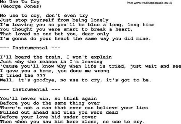 Lyrics to 'No Use In Crying' by Rolling Stones. Ain't no use in crying / Stay away from me / Ain't no use in crying / Stay away from me / Ain't no use in crying.GEORGE JONES LYRICS - No Use To Cry