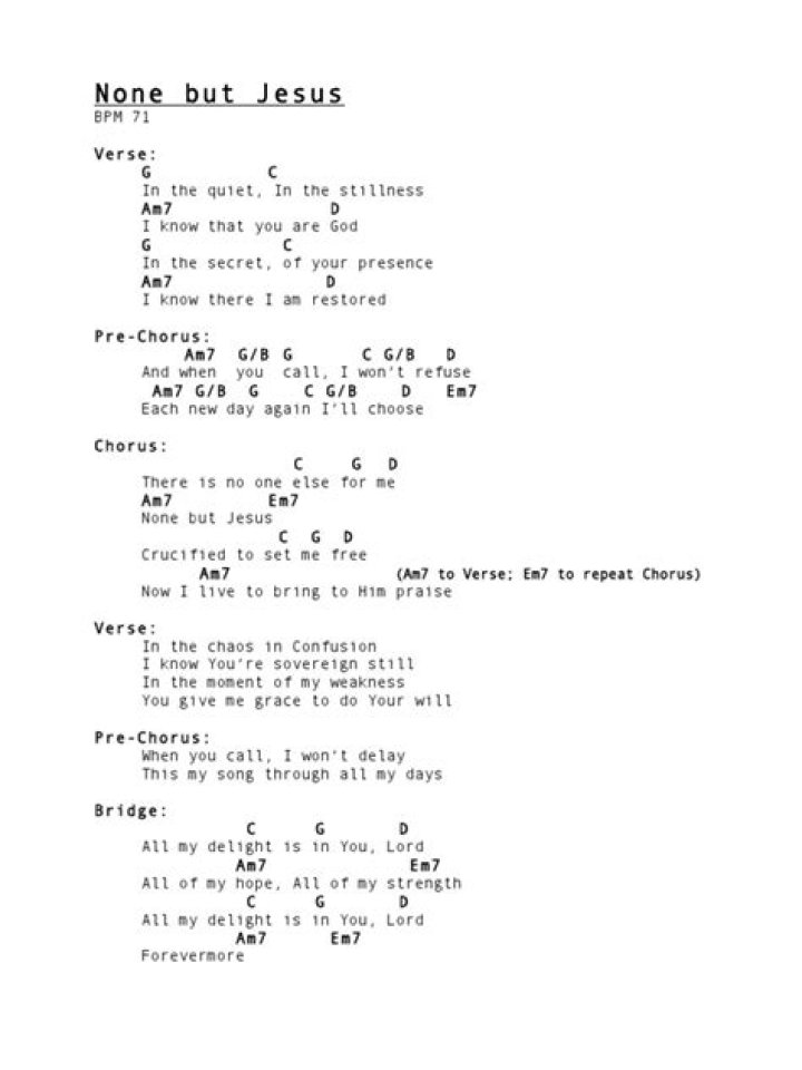 Jan 25, 2016 Lyrics for None But Jesus by Julie Starcher. In the quiet, in the stillness I know that you are God In the secret of your presence I know there I am ...HILLSONG WORSHIP - NONE BUT JESUS LYRICS