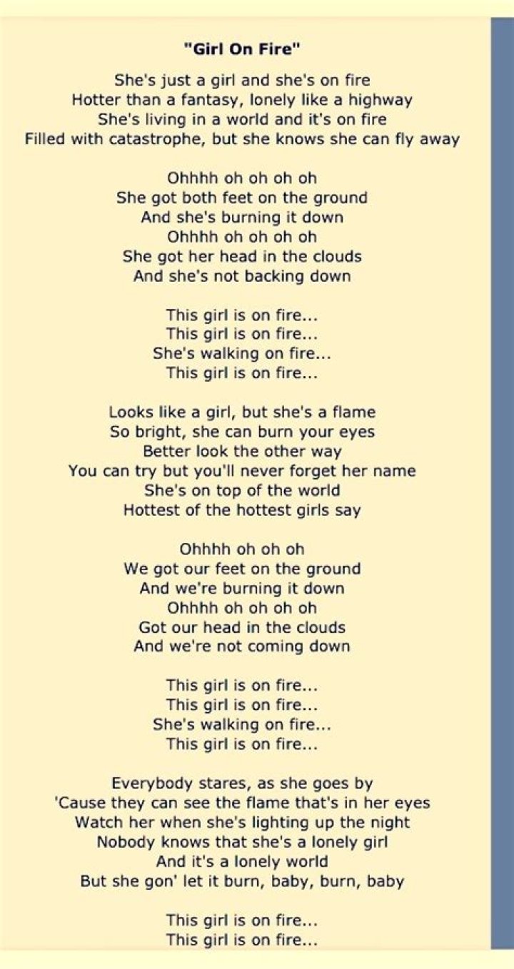 Heads on fire, that's what I been looking for Heads on fire, I can't take it anymore Heads on fire, is the only thing I adore And that's what I been looking for Deep down I looses what I need Then will be current me to come back strong, oh Clear memories inside my head They keep on telling me were I belong But my brain is too fake And I get a breakALICIA KEYS - GIRL ON FIRE LYRICS
