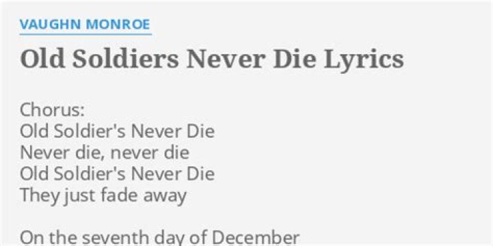 Never die, never die Old soldiers never die They just fade away Old soldiers never die Then from the land of way down under A mighty voice did say Our cause is just, in God we trust I will return someday From Mindanao to Tarawa Our battle song it grew Until on Suribachi At last old glory flew Old soldiers never die Never die, never die Old ...VAUGHN MONROE - OLD SOLDIERS NEVER DIE LYRICS