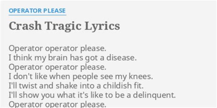 Operator Please - Crash Tragic Lyrics. Operator operator please. I think my brain has got a disease. Operator operator please. I don't like when people see my ...Operator Please Lyrics