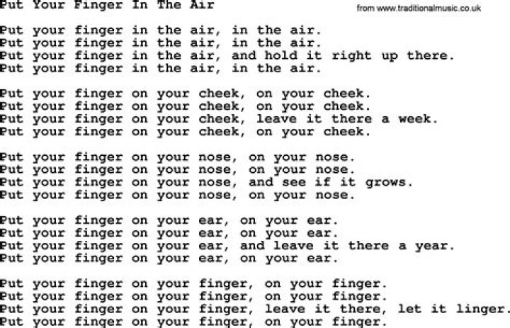 Lyrics to "Put Your Finger In The Air" song by ARLO GUTHRIE: Put your finger in the air, in the air. Put your finger in ... Put your finger in the air, and hold it right up there. Put your ... Put your finger on your cheek, leave it there a week. Put your ...JAY ROCK LYRICS - Elbows