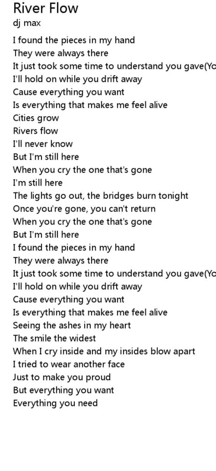 Get lyrics of River flow lyrics song you love. List contains River flow lyrics song lyrics of older one songs and hot new releases. Get known every word of your favorite song or start your own karaoke party tonight :-).