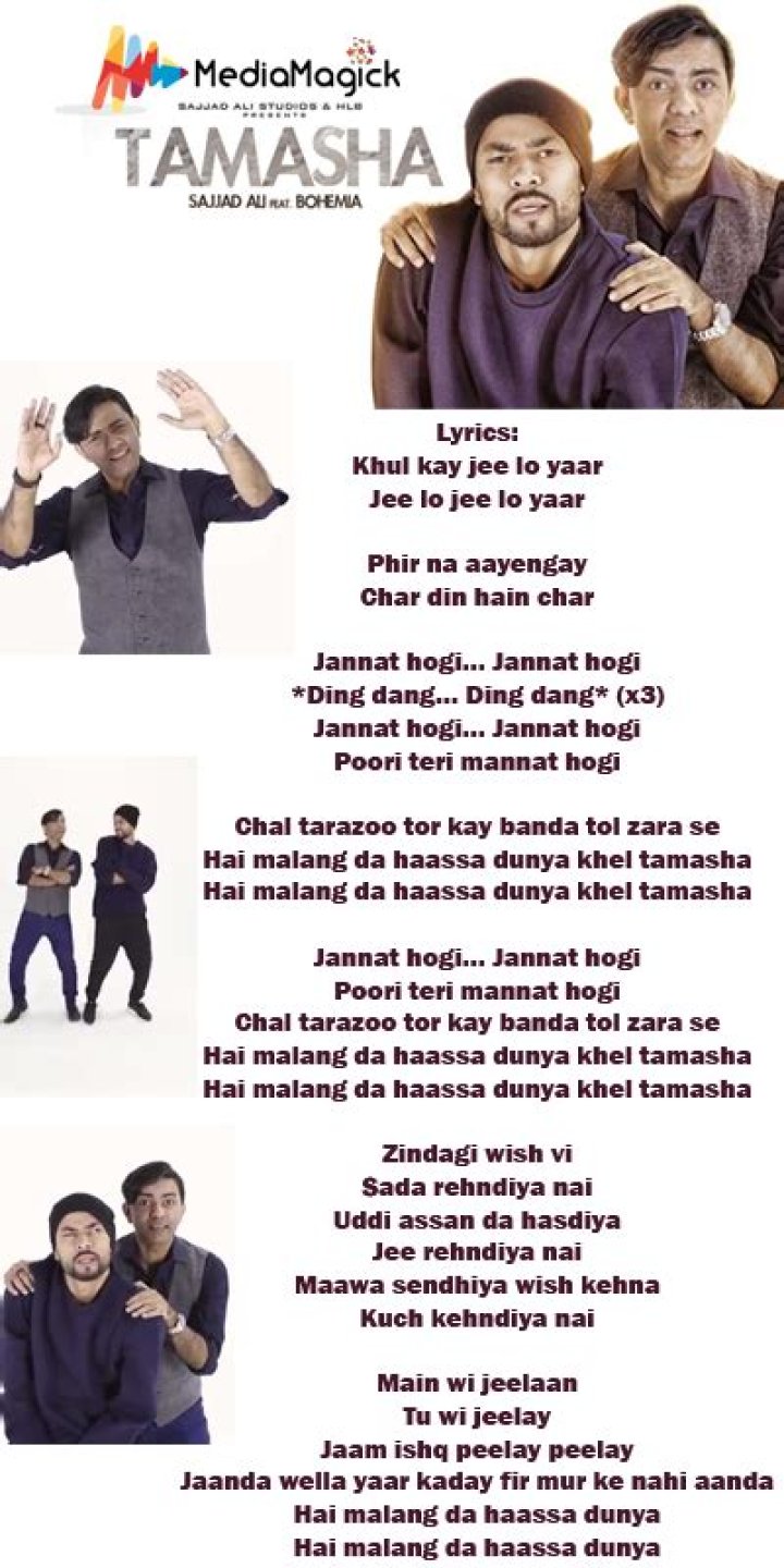 Type song title, artist or lyrics. Top lyrics Community Contribute Business. Sign in Sign up. LyricsTamasha Sajjad Ali, Bohemia. Last update on: July 27, 2017. 1 Translation available. Add Translation. farsi (6 %) Choose translation. The Lyrics for Tamasha by Sajjad Ali feat. Bohemia have been translated into 1 languages.Sajjad Ali - Din Pareshan Hai Lyrics