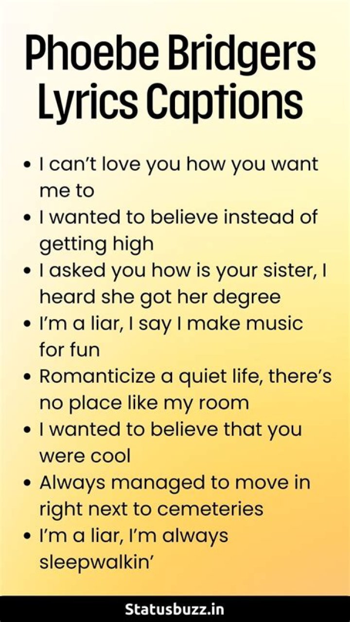 The Lyrics for Cool About It by boygenius feat. Julien Baker, Phoebe Bridgers & Lucy Dacus have been translated into 7 languages. Met you at the dive bar to go shoot some pool And make fun of the cowboys with the neck tattoos. I ask you easy questions about work and school I′m tryin' to be cool about it Feelin′ like an absolute fool about ...Phoebe Bridgers - ICU Lyrics