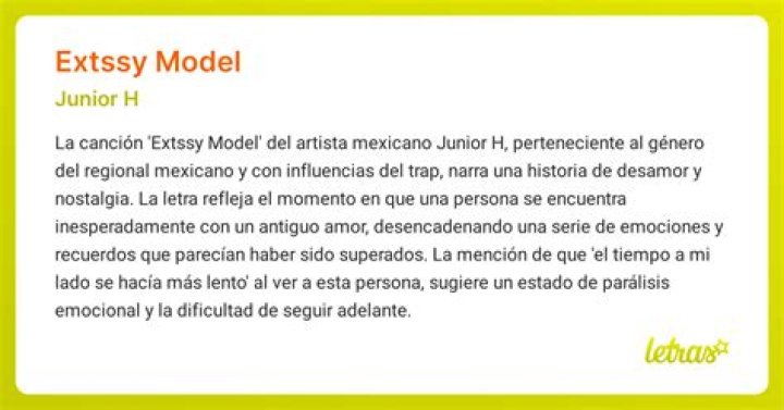 La canción «Extssy Model» de Junior H es una poderosa melodía que relata la historia de un hombre que se encuentra inesperadamente con su amor del pasado, reviviendo así los recuerdos de su relación. Esta canción me provoca una profunda conexión emocional, ya que he experimentado situaciones similares en mi vida que me han dejado una huella imborrable.