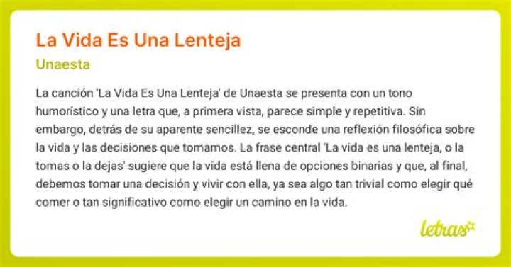 La canción «La Vida Es una Lenteja» de Unaesta ha logrado transmitir un mensaje despreocupado y juguetón sobre las elecciones y oportunidades de la vida. Esta popular canción ha capturado la atención de muchos oyentes debido a su contagioso ritmo y a las profundas reflexiones que se encuentran ocultas en sus letras.