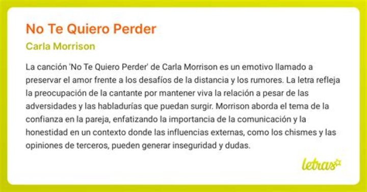 «No Te Quiero Perder» de Sabino (Ft. Carla Morrison) ha resonado profundamente en mí debido a las experiencias personales que he tenido en relaciones a distancia y la lucha contra los rumores y la desconfianza. Esta canción me ha recordado la importancia de confiar en mi pareja y mantener la fe en nuestra conexión, incluso cuando la distancia nos separa. También me ha inspirado a valorar los momentos que compartimos juntos y a trabajar en la comunicación y el compromiso para mantener una relación fuerte y amorosa.