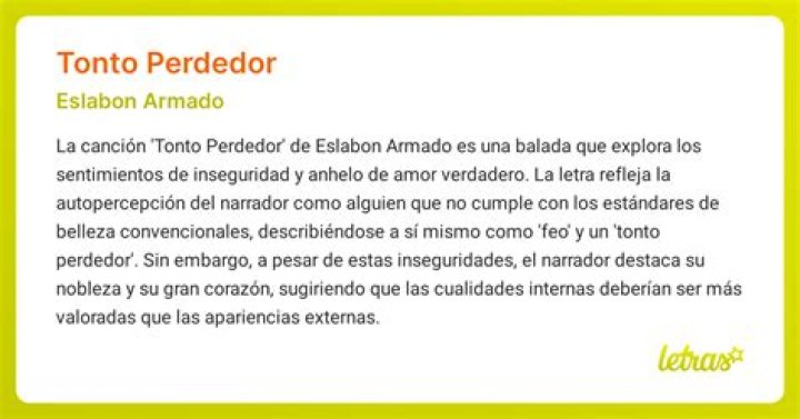 «Tonto Perdedor» narra la historia de una persona que se siente perdedora y no lo suficientemente buena para alguien a quien ama. Esta letra evoca sentimientos de inseguridad y baja autoestima, algo con lo que muchos hemos lidiado en algún momento de nuestras vidas. En mi caso, esta canción me recordó a una etapa en la que no me sentía merecedor del amor de otra persona, lo que generaba una constante lucha interna por no ser lo suficientemente valioso.
