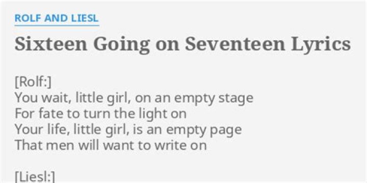 Get lyrics of Sixteen going on seventeen (rolf and liesl .. song you love. List contains Sixteen going on seventeen (rolf and liesl .. song lyrics of older one songs and hot new releases. Get known every word of your favorite song or start your own karaoke party tonight :-).
