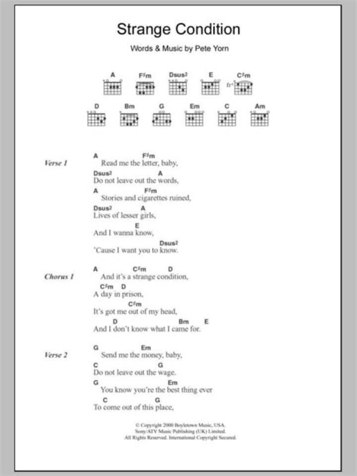 Lyrics for Strange Condition by Pete Yorn. Read me the letter, baby, Do not leave out the words. Stories and cigarettes ruined lives of lesser girls, And I wanna k.MORGAN PAGE - STRANGE CONDITION LYRICS