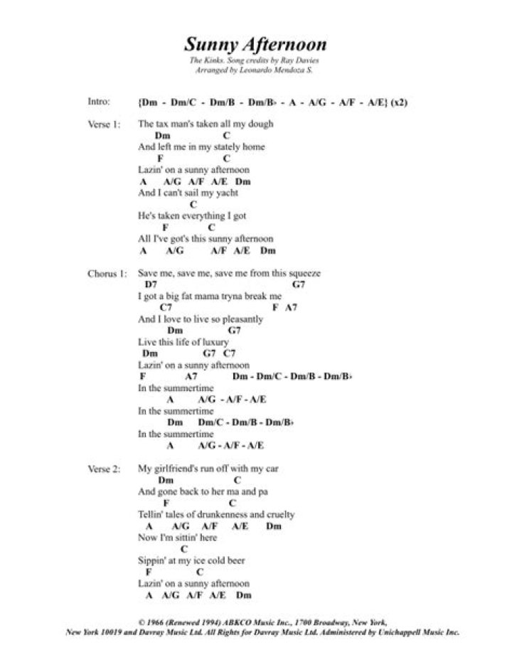 Sunny Afternoon lyrics performed by The Kinks: The tax man's taken all my dough, And left me in my stately home, Lazing on a sunny afternoon.THE KINKS - SUNNY AFTERNOON LYRICS