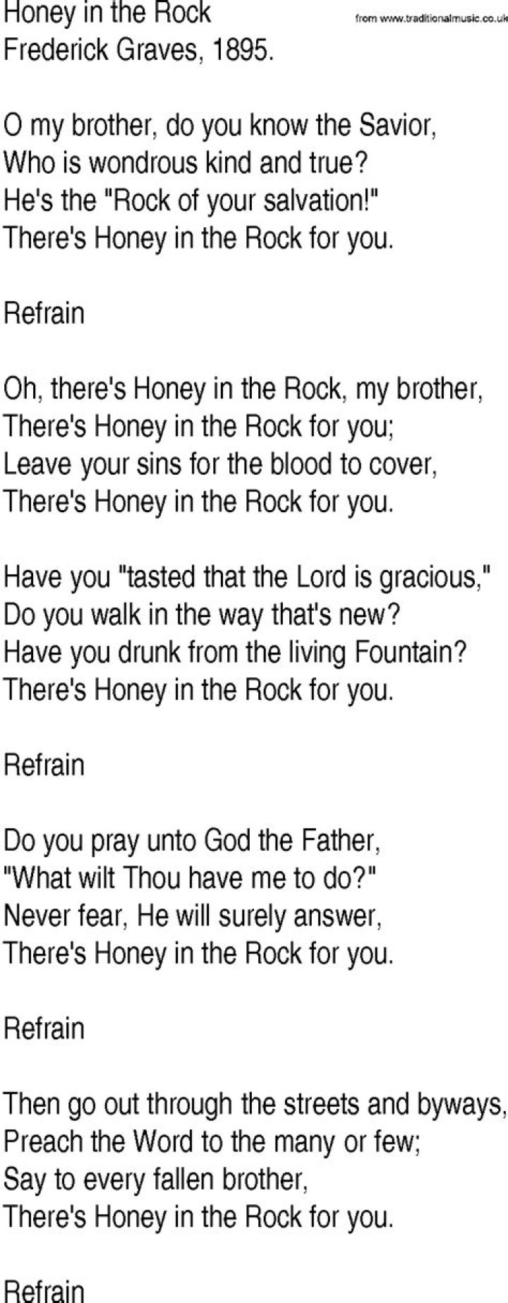 Sweet Honey in the Rock - Prayer 2 The One Lyrics. He is my everything, Both great & small. he is my everything, Now how about you? like Honey in the Rock, Sweet Honey in the Rock... for he tastes like Honey in the Rock... O, taste & see, that the lord is Good... for he tastes like Honey in the Rock. He is my everything, Both great & small.Sweet Honey in the Rock Song Lyrics by Albums