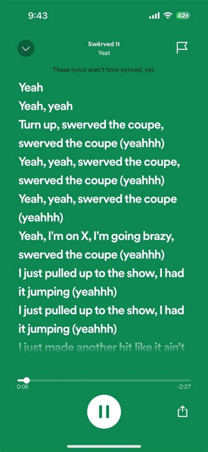 "Swërved It" lyrics Yeat Lyrics "Swërved It" (Outlit) Yeah Yeah, yeah Turn up, swerved the coupe, swerved the coupe Yeah, yeah, swerved the coupe, swerved the coupe Yeah, yeah, swerved the coupe Yeah, I'm on X, I'm going brazy, swerved the coupe I just pulled up to the show, I had it jumping I just pulled up to the show, I had it jumpingYeat - Swërved It Lyrics