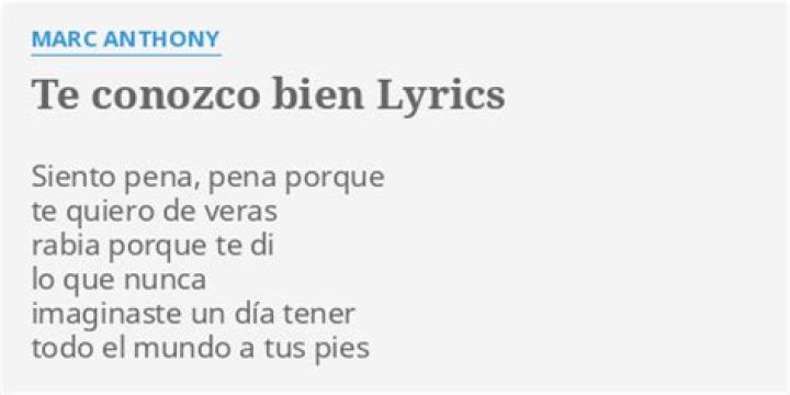 Marc Anthony - Te Conozco Bien Lyrics Artist: Marc Anthony Album: Todo A Su Tiempo Genre: Latin Heyo! SONGLYRICS just got interactive. Highlight. Review: RIFF-it. RIFF-it good. Listen while you read! Siento pena Pena porque te quise de veras Rabia porque te di Lo que nunca Imaginaste un dia tener Todo el mundo a tus pies Siento lastimaMarc Anthony - -Te Conozoco Bien Lyrics